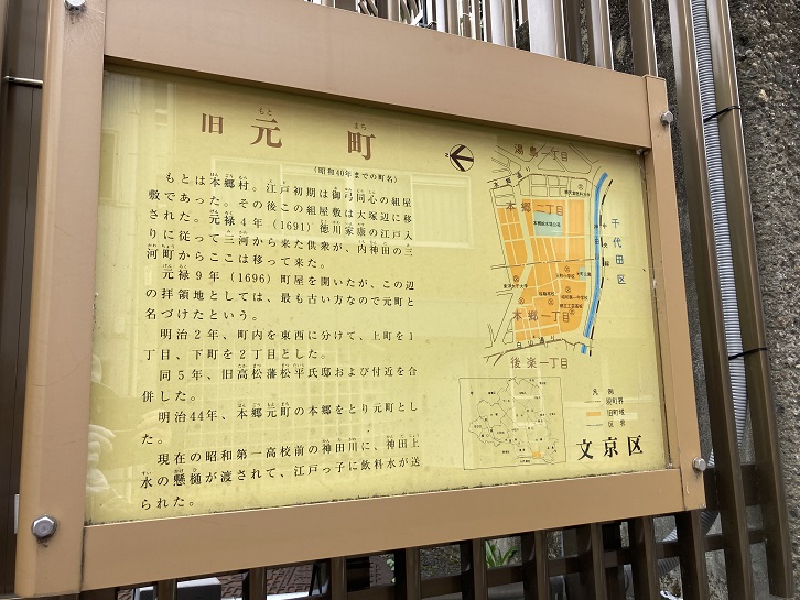 本郷二丁目交差点の手前に寄席の跡の案内板が立っています。