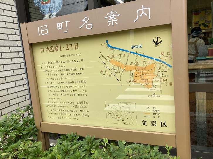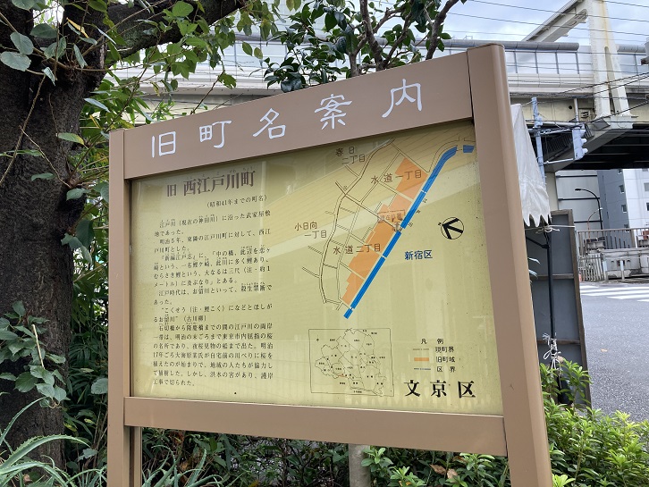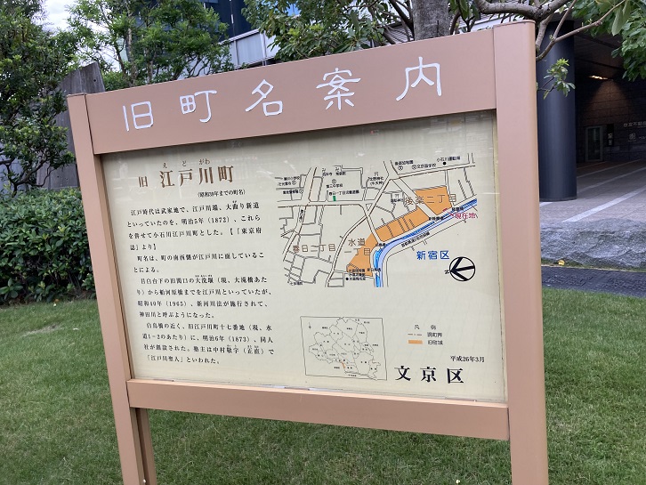 神田川のかっての川名の「江戸川」にちなんだ町名もありました。この辺りの両岸は、明治時代には桜の名所だったそうです。