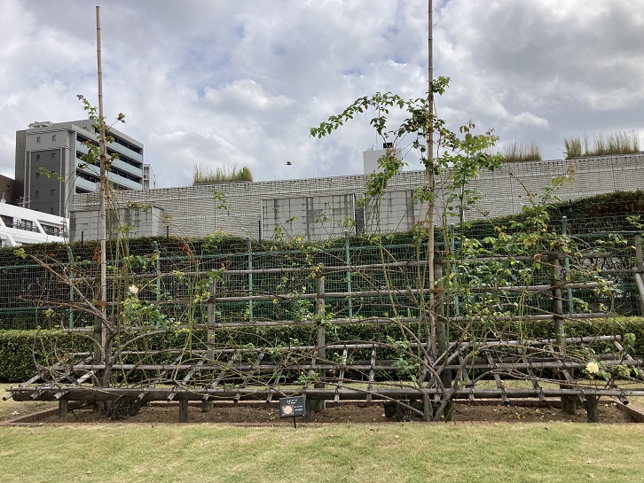 くり、当時としては珍しい、大規模な屋上庭園ができました。この屋上庭園は、武蔵野をイメージした「雑木林のゾーン」、「西洋風庭園のゾーン」、そして砂場や滑り台などがある「子供の遊び場」の、3つのゾーンに分けて作られました。西洋庭園部分には、はじめは四季の草花が植えられ、周囲にバラが植栽されました。それから数年後、草花の花壇にも、色とりどりのバラが植えられ、現在のバラ園の姿となりました。
