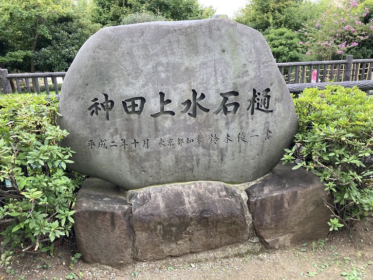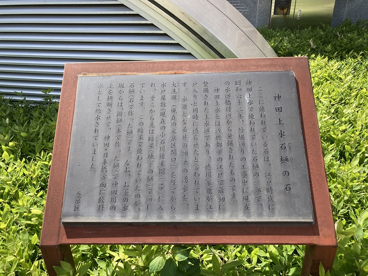 ここに使われている石は、江戸時代に神田上水で使われていた石樋の一部で、昭和六十二年、外堀通りの工事中に現在の水道橋付近から発掘されたものです。神田上水とは近世都市の江戸で最初に整備された上水道であり、コ川家康が江戸入りと同時に造らせたと言われています。水源となる井の頭池の湧水を、大洗堰(現在の文京区関口)を経てから水戸屋敷(現在の小石川後楽園一帯)に入れ、そこから先は暗渠(地下の樋)で通しています。この暗渠で使われていたのが、石樋(石で作った樋)です。なお、お茶の水坂からは、掛樋(木で作った樋)で神田川の上を横断させて、神田・目本橋方面に飲料水として給水されていました。