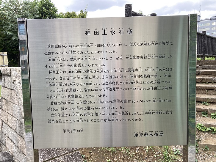 徳川家康が入府した天正十八年(1590年)頃の江戸は、広大な武蔵野台地の東端に位置する小さな村落であったといわれている。神田上水は、家康の江戸入府にさいして、家臣大久保藤五郎忠行が開削した小石川上水がその起源といわれている。神田上水は、井の頭池の湧水を水源とする神田川に善福寺川、妙正寺川の水路を合わせ、目白台下の大洗堰に至り、水戸藩邸を通って神田川を懸樋で渡し、神田、日本橋方面の飲み水などに利用していた江戸時代から明治時代はじめの水道である。この石樋(石垣樋)は、昭和六十二年から平成元年にかけて発掘された神田上水幹線水路の一部を移築復原したものである。石樋の内部寸法は、上幅150cm、下幅120cm、石垣の高さ120〜150cmで、長さ約180cm、幅60cm、厚さ30cm前後の蓋石がのせられている。江戸水道から現在の東京水道に至る400年を記念し、また、江戸時代遺跡の保存活用を図ることを目的としてここに移築復原したものである。