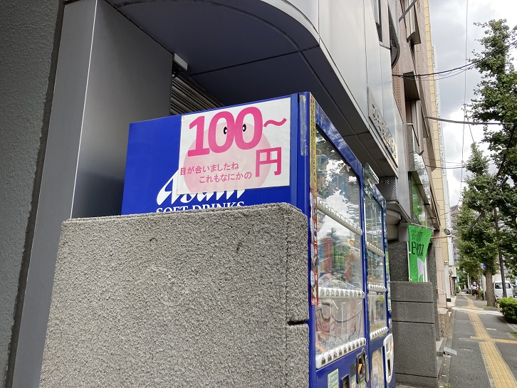 100円飲料自販機に面白いキャッチが貼ってあります。他では見たことがありませんね。目が合ったら買わざるを得ないかも。