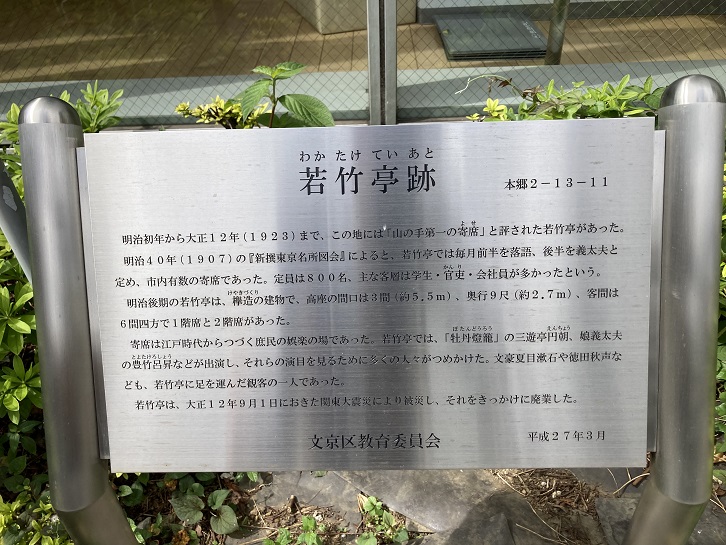 明治初年から大正十二年(1923年)まで、この地には「山の手第一の寄席」と評された若竹亭があった。明治四十年(1907年)の「新撰東京名所図会」によると、若竹亭では毎月前半を落語、後半を義太夫と定め、市内有数の寄席であった。定員は800名、主な客層は学生・官吏・会社員が多かったという。明治後期の若竹亭は、欅造の建物で、高座の間口は3間(約5.5m)、奥行9尺(約2.7m)、客間は6間四方で1階席と2階席があった。寄席は江戸時代からつづく庶民の娯楽の場であった。若竹亭では、「牡丹燈籠」の三遊亭円朝、娘義太夫の豊竹呂昇などが出演し、それらの演目を見るために多くの人々がつめかけた。文豪夏目漱石や徳田秋声なども、若竹亭に足を運んだ観客の一人であった。若竹亭は、大正十二年9月1日におきた関東大震災により被災し、それをきっかけに廃業した。