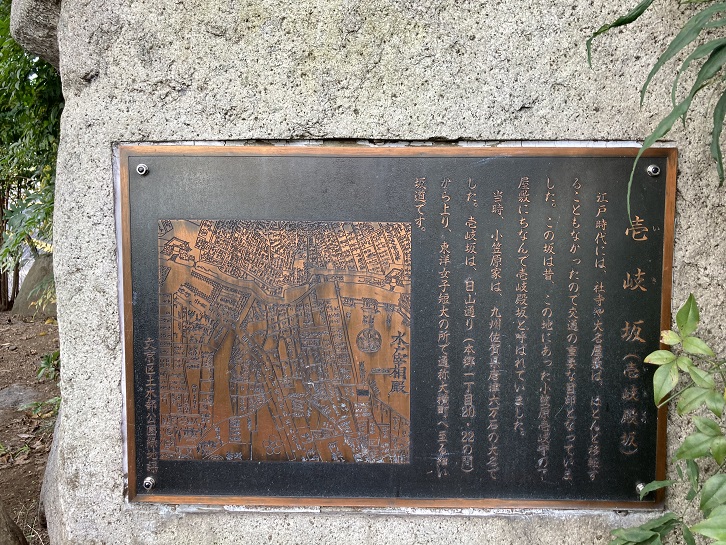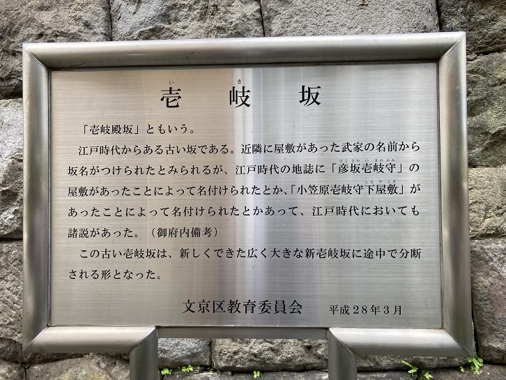 江戸時代には、社寺や大名屋敷は、ほとんど移転することもなかったので交通の重要な目印となっていました。この坂は昔、この地にあった小笠原壱岐守の下屋敷にちなんで壱岐殿坂と呼ばれていました。当時、小笠原家は、九州佐賀県唐津六万石の大名でした。壱岐坂は、白山通り(本郷一丁目20・22の間)から上り、東洋女子短大の所で通称大横町へ至る細い坂道です。