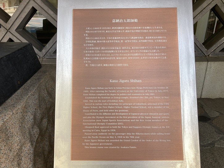 講道館の建物の入口の横に講道館の創始者である嘉納治五郎の銅像と業績を記した案内板が置かれています。