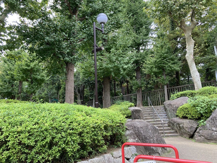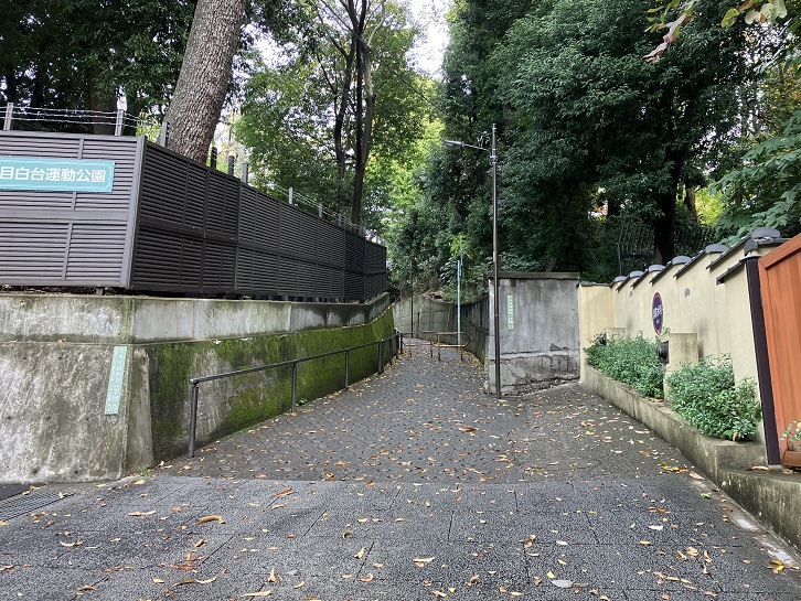 とある住宅地の路地の角で左折し、目白通りに出ます。正面に見所ポイントFの「目白台運動公園」があります。3万平方メートル超の敷地の一部は田中角栄元首相のかっての目白御殿の敷地でした。相続税が膨らんで物納されたのだそうです。目白台運動公園の脇から細川庭園の西側に下る幽霊坂と呼ばれる細い急坂があります。高い塀に挟まれ、両側には巨木が鬱蒼と葉を茂らせていますので、昼なお暗しといった雰囲気です。角栄さんが幽霊になって現れることはないとは思いますが。ちなみに、幽霊坂は戦後細川家が整備して和敬塾に引き継がれた私道です。あまり人も通らない寂しい坂道でしたので、この坂道を利用して地域の人たちが肝試しを行ったために幽霊坂と呼ばれるようになったといわれています。現在は地元の住民にもよく利用されていて、急な斜面を乳母車を押して上る母子の姿もしばしば見られます。