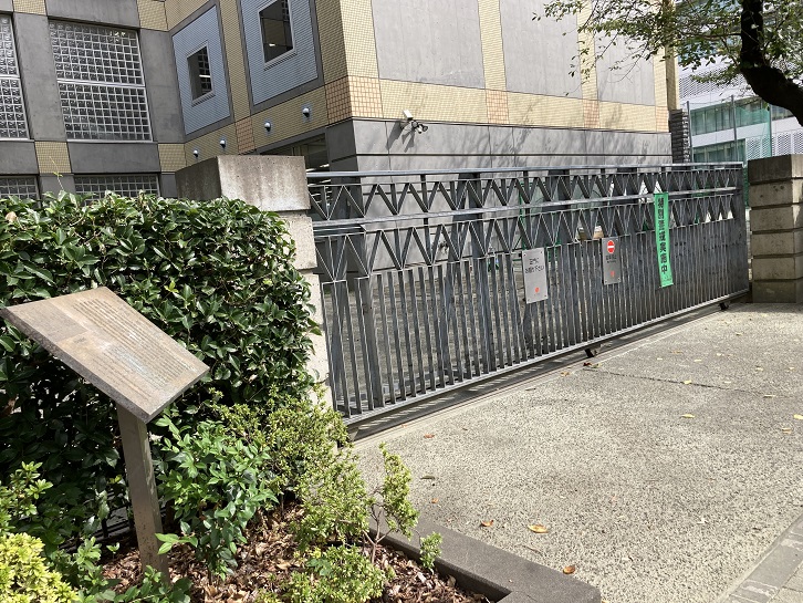 三丁目坂の坂上にかっての東大医学部附属病院分院の守衛所と正門と塀の遺構が残されています。