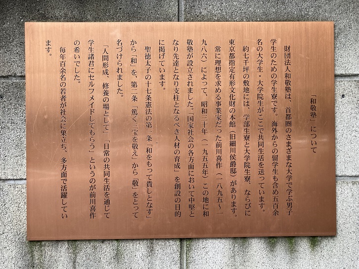 財団法人和敬塾は、首都圏のさまざまな大学で学ぶ男子学生のための学生寮です。海外からの留学生も含め五百余名の大学生・大学院生がここで共同生活を送っています。約七千坪の敷地には、学部生寮と大学院生寮、ならびに東京都指定有形文化財の本館(旧細川侯爵邸)があります。常に理想を求める事業家だった前川喜作(1895年〜1986年)によって、昭和三十年(1955年)この地に和敬塾が設立されました。「国家社会の各方面において中堅となり先達となり支柱となるべき人材の育成」を創設の目的に掲げています。聖徳太子の十七条憲法の第一条「和をもって貴しとなす」から「和」を、第二条「篤く三宝を敬え」から「敬」をとって名づけられました。「人間形成、修養の場として」「日常の共同生活を通じて学生諸君にセルフメイドしてもらう」というのが前川喜作の希いでした。毎年百余名の若者が社会に巣立ち、多方面で活躍しています。