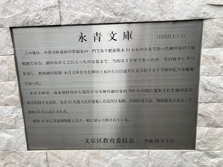 この地は、中世室町幕府の管領家の一門であり肥後熊本54万石の大名であった細川家の下屋敷跡である。細川家がここに入ったのは幕末で、当時は3千坪であったが、その後少しずつ拡張し、肥後細川庭園・永青文庫を含む神田上水から目白通りに及ぶ約3万8千坪の広大な敷地であった。永青文庫は、南北朝時代から現在に至る歴代細川家約700年の間に蒐集された細川家の歴史資料や文化財、及び24代護立氏が蒐集した近代日本画、中国の考古品、陶磁器などを以って昭和二十五年に設立された。昭和四十八年に登録博物館となり一般に展示公開されている。