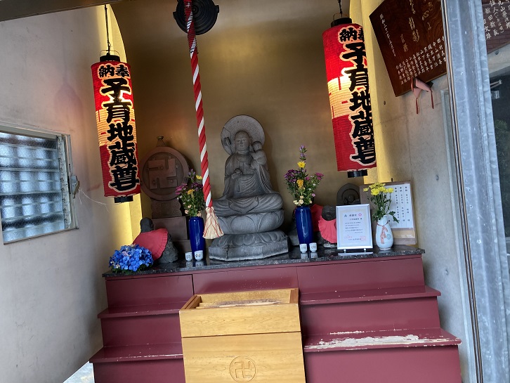 そんな地蔵通り商店街の入口付近に見所ポイントLの「子育地蔵尊」があります。子育地蔵(火伏せ地蔵)は、地蔵通り商店街の名前の由来となっているお地蔵様で、赤ん坊を抱いた姿をしています。こちらの子育地蔵は、江戸時代に神田川が氾濫した際にどこからか流れてきて、この地に留まったと言い伝えられています。また、優しいお顔をした尊像に接した里人が、この地にお祭りして以来、子育て・商売繁盛、戦災のほか大火に見舞われないことから「火伏せ地蔵」としても敬まわれています。