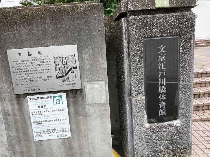 商店街の外れ近くで左折し、目白通りを横断し、神田川を古川橋で渡ります。小日向神社入口交差点から坂が上がっています。服部坂は、文京江戸川橋体育館の横を北方向に上る長さ100mほどの坂です。体育館の入口横の壁に案内板が貼られています。蛇足ですが、戦災で廃校となったのは黒田小学校で、戦後になって跡地に旧第五中学校が建てられ、平成二十一年(2009年)に旧第五中学校は生徒数の減少により旧第七中学校と統合され、廃校になりました。