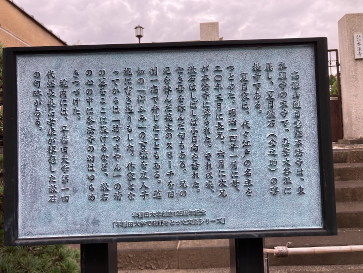 高源山随自意院本法寺は、東本願寺の末寺で、真宗大谷派に属し、夏目漱石(金之助)の菩提寺である。夏目家は、代々江戸の名主をつとめた。明治十四年一月に母、二十年三月に長兄、六月に次兄が本法寺に葬られた。それ以来、漱石はしばしば小日向を訪れた。亡き母を詠んだ句もある。兄の死を悼んだ英文のスピーチを旧制一高で弁じたこともある。蓮如の「御ふみ」の言葉を友人子規に書き送りもした。作家となってからは「坊つちやん」の清の墓をここに設けるなど、漱石の心の中に本法寺の幻はゆらめきつづけた。境内には、早稲田大学第一四代総長奥島孝康が揮毫した漱石の句碑がある。