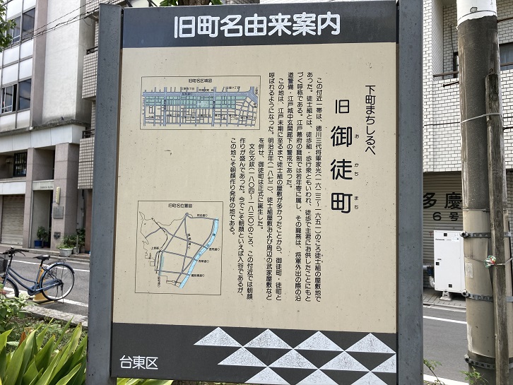 この付近一帯は、徳川三代将軍家光(1623年〜1651年)のころ徒士組の屋敷地であった。徒士組とは、徒歩組・歩行衆ともいわれ、徒歩で主君にお供したことにもとづく呼称である。江戸幕府の職制では若年寄に属し、その職務は、将軍外出の際の沿道警備・江戸城中玄関廊下の警戒であった。この地は、江戸末期に至るまで徒士組の屋敷が多かつたことから、御徒町・徒町と呼ばれるようになった。明治五年(1872年)、徒士組屋敷および周辺の武家屋敷などを併せ、御徒町は正式に誕生した。文化文政(1804年〜1830年)のころ、この付近では朝顔作りが盛んであった。今でこそ朝顔といえば入谷であるが、この地こそ朝顔作り発祥の地である。