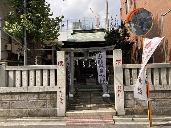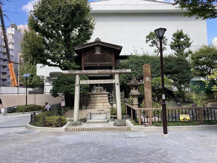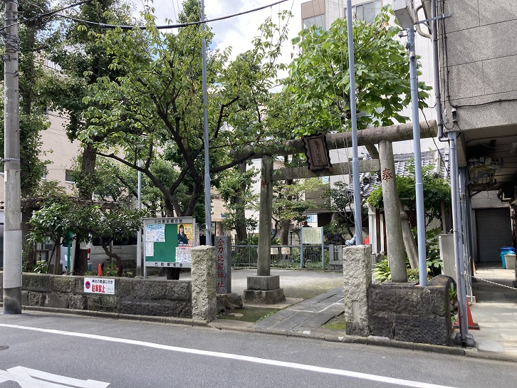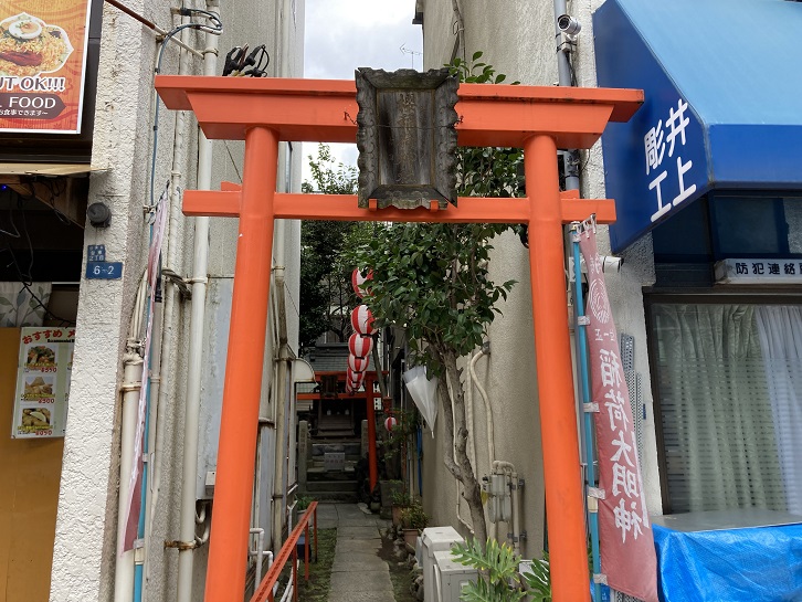昭和通りを横断し、蔵前橋通りを東に進みます。民家の間に挟まれた細い参道の奥に見所ポイントEの「桜稲荷」が鎮座しています。小さいながらも朱の鳥居が目立ちます。案内板には、伊勢の津藩主藤堂邸にあった稲荷に、戦後になって京都伏見稲荷本社から御本体を遷座したとあります。「桜(櫻)」は何に由来するんでしょうか?