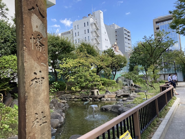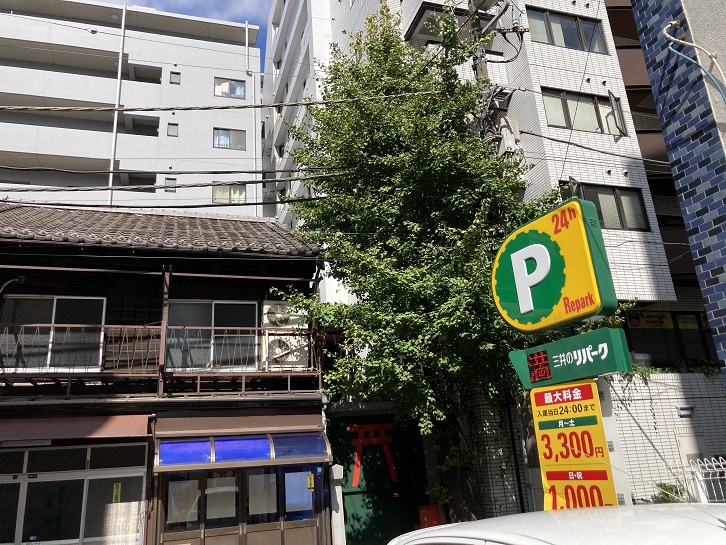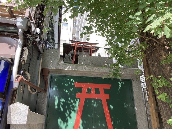 再び昭和通りを渡り、向かいの路地に入ります。見所ポイントGの「矢場稲荷」は、ビルと民家の隙間に窮屈そうに鎮座しています。入口らしき扉門は閉められていて、中には入れません。見上げると鳥居と狛犬と社が見えるんですけどね。よく見ますと、扉門の前に聳えている銀杏の木に梯子が立て掛けてあり、神社に行くにはこの梯子を使って境内に登るみたいです。こんな方法でしか境内に入れない神社って初めて見ました。