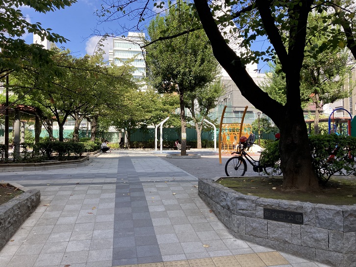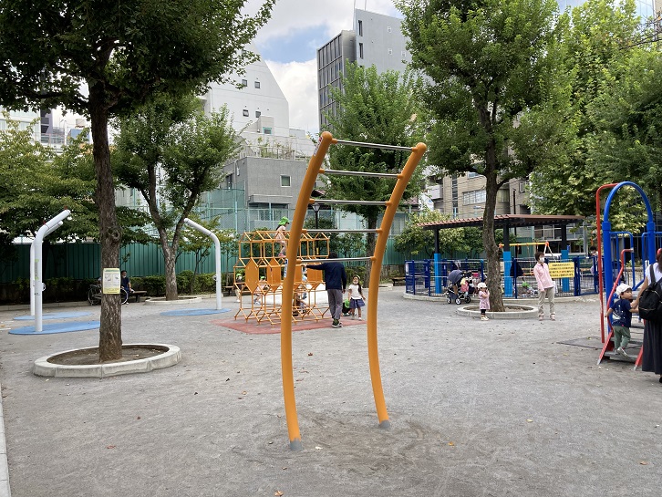 公園は東西に長い長方形の敷地になっていて、東側に子供向けの遊具や砂場があり、西側は広場になっています。西側の広場には樹木があちこちに植えてあり、木陰が近隣の住民や近くで働く人達の憩いの場となっています。最近流行の健康器具なども置いてあります。昼休みに体をほぐせそうですね。