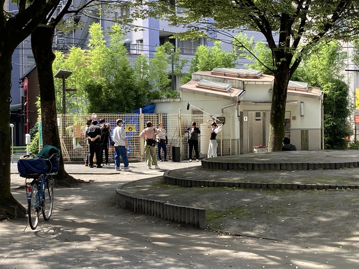 御徒町公園はドラマのロケ地として度々撮影で使われ、これまで何度かドラマの作品に登場しています。2019年に放送されたフジテレビドラマ「まだ結婚できない男」で磯村勇斗さん演じる矢野亮介が阿部寛さん演じる桑野信介に相談した公園として登場していました。2014年にはTBSドラマ「ペテロの葬列」、2012年にはフジテレビドラマ「遅咲きのヒマワリ〜ボクの人生、リニューアル〜」やテレビ朝日ドラマ「ボーイズ・オン・ザ・ラン」に登場しています。それ以前にも何度かドラマ作品に登場しています。石の鳥居を構えた神社がある御徒町公園は、公園としての人気は勿論ですがドラマのロケ地としても人気です。今日はドラマではなく、お散歩番組の収録でしょうか?