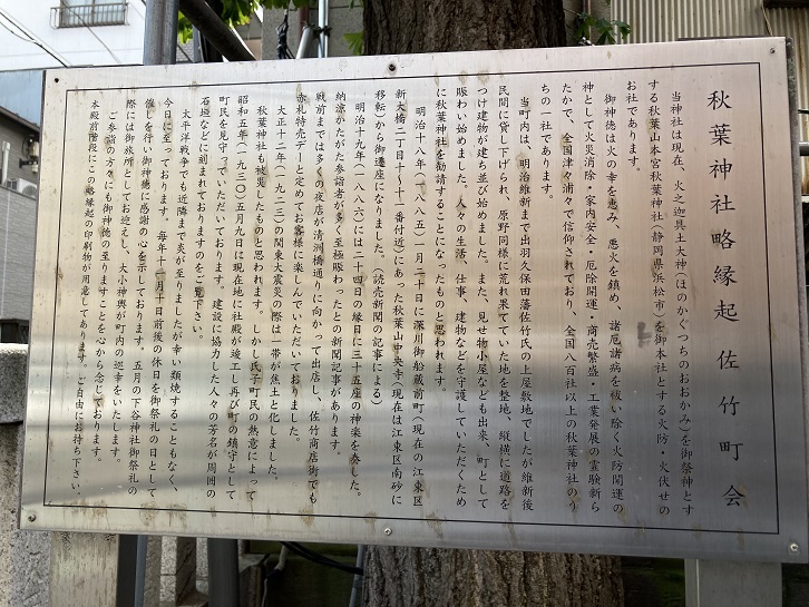 当神社は現在、火之迦具土大神(ほのかぐつちのおおかみ)を御祭神とす(す)る秋葉山本宮秋葉神社(静岡県浜松市)を御本社とする火防・火伏せのお社であります。御神徳は火の幸を恵み、悪火を鎮め、諸厄諸病を祓い除く火防開運の神として火災消除・家内安全・厄除開運・商売繁盛・工業発展の霊験新らたかで、全国津々浦々で信仰されており、全国八百社以上の秋葉神社のうちの一社であります。当町内は、明治維新まで出羽久保田藩佐竹氏の上屋敷地でしたが維新後民間に貸し下げられ、原野同様に荒れ果てていた地を整地、縦横に道路をつけ建物が建ち並び始めました。また、見せ物小屋なども出来、町として賑わい始めました。人々の生活、仕事、建物などを守護していただくために秋葉神社を勧請することになったものと思われます。明治十八年(1885年)一月二十日に深川御船蔵前町(現在の江東区新大橋二丁目十〜十一番付近)にあった秋葉山中央寺(現在は江東区南砂に移転)から御遷座になりました(読売新聞の記事による)。明治十九年(1886年)には二十四日の縁日に三十五座の神楽を奏した。納涼かたがた参詣者が多く至極賑わったとの新聞記事があります。戦前までは多くの夜店が清洲橋通りに向かって出店し、佐竹商店街でも赤札特売デーと定めてお客様に楽しんでいただいておりました。大正十二年(1923年)の関東大震災の際は一帯が焦土と化しました。秋葉神社も被災したものと思われます。しかし氏子町民の熱意によって昭和五年(1930年)五月九日に現在地に社殿が竣工し再び町の鎮守として町民を見守っていただいております。建設に協力した人々の芳名が周囲の石垣などに刻まれておりますのをご覧下さい。太平洋戦争でも近隣まで炎が至りましたが幸い類焼することもなく、今日に至っております。毎年十一月十日前後の休日を御祭礼の日として催しを行い御神徳に感謝の心を示しております。五月の下谷神社御祭礼の際には御旅所としてお迎えし、大小神輿が町内の巡幸をいたします。ご参詣の方々にも御神徳の至りますことを心から念じております。本殿前階段にこの略縁起の印刷物が用意してあります。ご自由にお持ち下さい。
