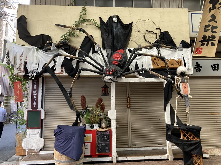 ピザ店(居酒屋?)のようですが、巨大な蜘蛛と骸骨に迎えられてお店に入る勇気はあるのでしょうか?