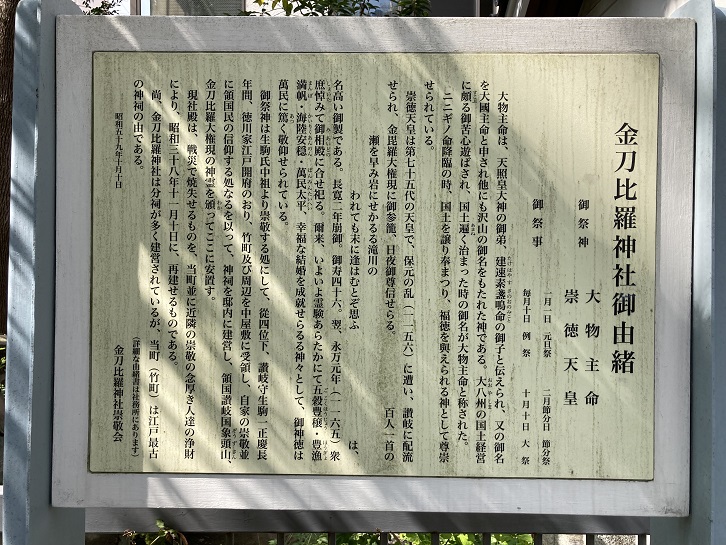 は、名高い御製である。長寛二年崩御。御寿四十六。翌、永万元年(1165年)衆庶悼みて御相殿に合せ祀る。爾来、いよいよ霊験あらたかにて五穀豊穣・豊漁満帆・海陸安穏・萬民太平、幸福な結婚を成就せらるる神々として、御神徳は萬民に篤く敬仰せられている。御祭神は生駒氏中祖より崇敬する処にして、従四位下、讃岐守生駒一正慶長年間、徳川家江戸開府のおり、竹町及び周辺を中屋敷に受領し、自家の崇敬並に領国民の信仰する処なるを以って、神祠を邸内に建営し、領国讃岐国象頭山、金刀比羅大権現の神霊を頒ってここに安置す。現社殿は、戦災で焼失せるものを、当町並に近隣の崇敬の念厚き人達の浄財により、昭和三十八年十一月十日に、再建せるものである。尚、金刀比羅神社は分祠が多く建営されているが、当町(竹町)は江戸最古の神祠の由である。