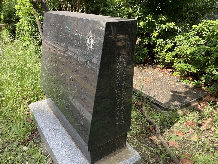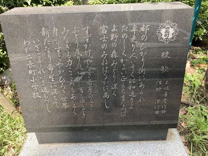 二長町小学校は、明治十一年に開校した下谷練塀小学校を始まりとしています。下谷練塀小学校は、大正十二年の関東大震災で焼失し、当時の下谷区仲御徒町59番地(現在の台東区上野五丁目)から二長町2番地の2(現在の台東区台東一丁目)に移転しました。その後、昭和二十年4月3日の空襲で校舎が被災し、昭和二十一年に御徒町小学校と統合され、昭和二十二年の学制改革により、台東区立二長町小学校と改称しました。平成二年に二長町小学校と竹町小学校が統合して台東区立平成小学校が開校し、二長町小学校は閉校となりました。廃校後に校舎は解体され、跡地に台東地区センターが建てられました。いきいきプラザの植え込みの中に、二長町小学校創立百周年を記念した石碑が置かれています。石碑には校歌が刻まれ、作詞者は歌人として多くの学校の校歌を書いた土岐善麿です。その数は小学校で90曲、中学校で89曲、旧制中学校で2曲、高等学校・高専で85曲、大学・海外・その他含めて14曲という膨大な数になっています。なお、作曲は平井康三郎・信時潔が多くを手がけています。