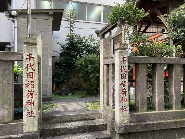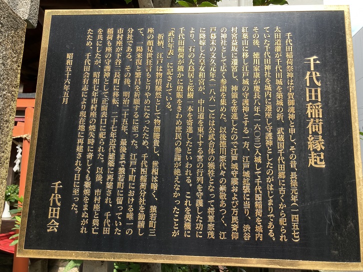 千代田稲荷祭神は宇賀御魂神と申し、その昔、長禄元年(1457年)太田道灌が千代田城を築城の折、武蔵国千代田郷に古くから祀られていた千代田神社を城内に遷座し守護神としたのがはじまりである。その後、徳川家康が慶長八年(1603年)入城して千代田稲荷を城内紅葉山に移し江戸城の守護神とする一方、江戸城拡張に当り、渋谷村宮益坂に遷宮し、神領を寄進したので江戸城守護および万民斉仰の神社として広く参詣を集めた。以後徳川家代々の崇敬あつく、江戸幕末の文久元年(1861年)には公武合体の犠牲となって将軍家茂に降嫁した皇女和宮が、中山道を東下する宮の行列を守護した功により、石の大鳥居と桜樹一本を寄進したといわれる。これを契機に千代田稲荷が俄かに殷賑をきわめ庶民の参詣が絶えなかったことが「武江年表」に記されている。折柄、江戸は物情騒然として物価騰貴し、世相は暗く、猿若町三座の顔見世狂言もとりやめになったため、千代田稲荷分社を勧請して、一陽来復と繁昌を祈願するに至った。江戸下町における唯一の分社である。その後、明治二十五年、最後まで猿若町に留っていた市村座が下谷二長町に移転、二十七年近代建築に再建され、千代田稲荷も座の守護神として正面口に祀られた。以後、市村座と興亡を共にしたが、昭和七年市村座の焼失時に奇しくも類焼をまぬがれたため、千代田会有志により現在地に再建され今日に至った。