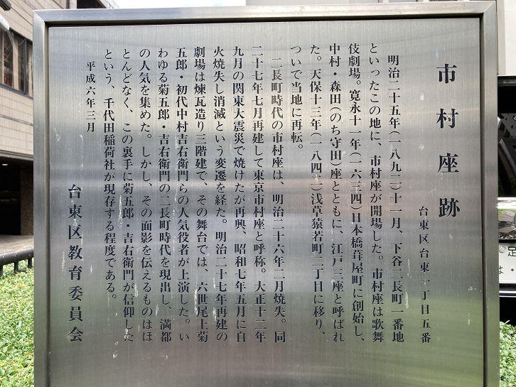 見所ポイントDの「市村座跡地」には記念碑が建っています。市村座は江戸にあった歌舞伎劇場で、江戸三座のひとつでした。寛永十一年(1634年)に村山又三郎が興した村山座に始まり、承応元年(1652年)に市村羽左衛門が興行権を買い取り市村座としました。当初は日本橋葺屋町(現在の日本橋人形町三丁目)にありましたが、天保十三年(1842年)に前年の火災と天保の改革の一環により、浅草猿若町(現在の台東区浅草六丁目)に移転しました。その後、明治二十五年(1892年)に猿若町から下谷二長町(現在の台東区台東一丁目)に移転しました。1908年以降、田村成義が若手俳優の六代目尾上菊五郎や初代中村吉右衛門らを育て、大正に入ると歌舞伎座や帝国劇場に対抗して市村座全盛期を迎えました。「菊吉時代」・「二長町時代」と呼ばれたのはこの頃のことです。市村座は関東大震災で焼失し、バラック建てで復興しましたが、昭和七年(1932年)に楽屋からの失火で焼失した後は再建されず、寛永の時代から櫓を上げ続けていた市村座の歴史は終焉を迎えました。