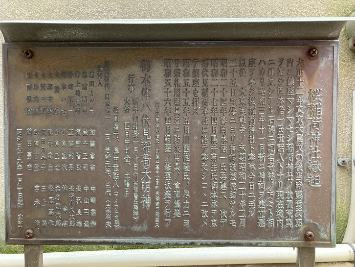 大正十二年、東京大震災の後、当時藤堂家邸内ニ鎮座マシマセシ稲荷神社ノ放置荒廃ヲ案ジ、岡本悟一氏世話人トナリ、現在境内ニ建立シアル石碑ニ記名奇特ノ方々ト相ハカリ、昭和三年十一月新ニ神祠ヲ建立、遷座ヲ奉ジ桜稲荷神社ト奉称、今日ニ至ル。以後、大東亜戦争ノ末期、昭和二十年二月二十五日、空爆ニヨリ神祠破壊焼却セルモ、昭和二十四年春岡本悟一氏再建ス。次デ昭和二十七年四月、隅井菊生氏御本体ヲ京都伏見稲荷本社に詣デ奉受シ、コゝニ改メテ鎮座ヲ拝ス。昭和五十五年五月、川西惟隆氏ノ尽力ニヨリ祭礼用器具並ニ防災用具ノ倉庫構築、昭和五十六年四月祠屋ノ修理改築ヲ行フ。