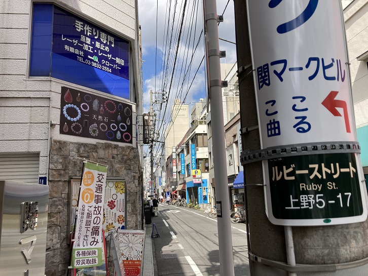 JR線と昭和通りの間に、見所ポイントFの「ジュエリータウンおかちまち」ストリートがあり、通りの両側に宝石や貴金属のお店が軒を連ねています。御徒町駅前は戦災で焼け野原となった空き地が多く、上野駅にも近いという立地を活かして、昭和三十年(1975年)11月21日に時計関係の問屋有志12社で「仲御徒町問屋連盟」が結成されました。昭和五十年(1975年)以降、クオーツ時計が広まるにつれ、駅の南側近辺において時計バンド卸商や時計の修理店がそれまで副業的に取り扱っていたジュエリーに業種転換を図るようになりました。宝石の消費の増大と、それに対応する供給側の増大がうまくかみ合って、業者数も増えていきました。街作りと共同セールの開催を目的として、昭和六十二年(1987年)9月、上野五丁目と三丁目のジュエリー業者159社が集まって「ジュエリータウンおかちまち」が設立され、平成元年(1989年)頃には御徒町地区だけで一千社以上もあるといわれていましたが、過当競争と景気低迷で数が次第に減り、2000年代に入ってからは半分程度にまで減少しました。近年では、古くから宝石の産出国として知られ、マハラジャやマハラニの絢爛豪華な宝飾品の数々を長年手掛けてきたインドの業者が目覚ましく進出しています。
