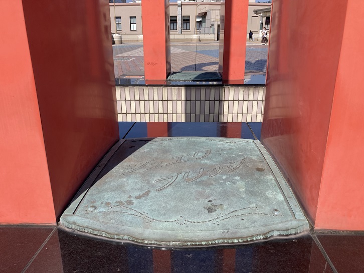 「ジュエリーブリッジ」は1991年に完成し、広場(厳密には歩行者用通路)には見所ポイント@の「ペデストリアンデッキのモニュメント」が展示されています。金色のリングと赤い柱からなるモニュメントは、高さが10m、幅が6m、奥行が5mあり、見た目には何をモチーフにしているのか分かりませんが、「日」を表しているのだそうです。土台部分には「ジュエリーブリッジ」と書かれたプレートが貼られています。