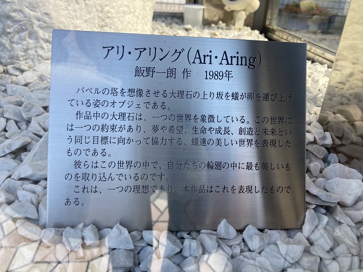 モニュメントの隣には、アリ塚のような形をした彫像がケースに納められています。「アリ・アリング」といい、作者は東京藝術大学の工芸科で40年にわたって彫金を指導した彫金家の飯野一朗さんです。「バベルの塔」をイメージした蟻塚と、それを登る金色の蟻は全て彫金で制作されているみたいです。蟻の一匹一匹が彫金で作られているとは驚きです。