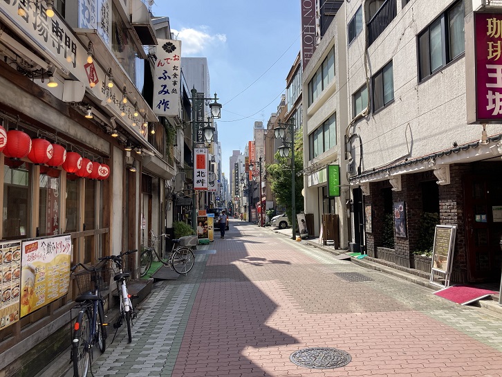 よみせ通り商店街は、現在は暗渠となった藍染川の流路の上にあります。よみせ通りの出口のところには、かつて橋が架かっていました。その先はくねくねと曲がった「へび道」と呼ばれる路地になっています。路地の東側は台東区、西側は文京区です。