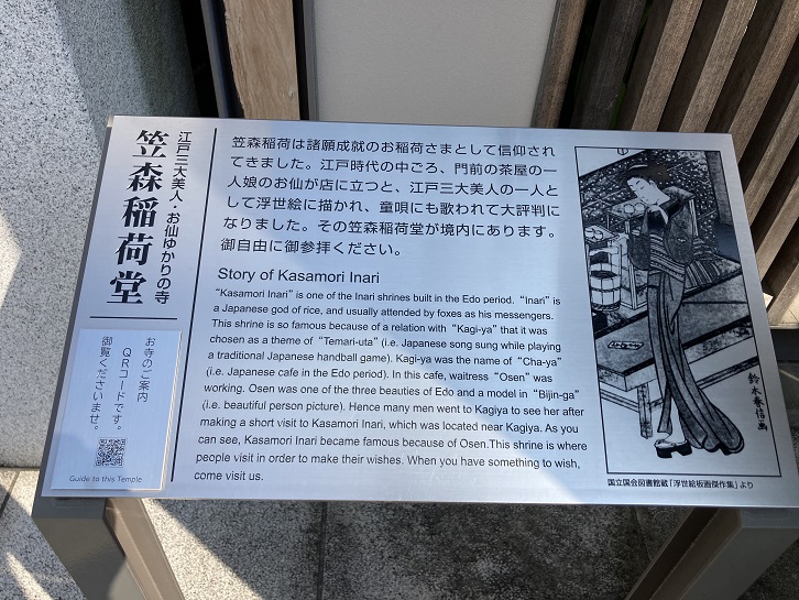 a Japanese god of rice, and usually attended by foxes as his messengers. This shrine is so famous because of a relation with "Kagi-ya" that it was chosen as a theme of "Temari-uta" (i.e. Japanese song sung while playing a traditional Japanese handball game). Kagi-ya was the name of "Cha-ya" (i.e. Japanese cafe in the Edo period). In this cafe, waitress "Osen" was working. Osen was one of the three beauties of Edo and a model in "Bijin-ga" (i.e. beautiful person picture). Hence many men went to Kagiya to see her after making a short visit to Kasamori Inari, which was located near Kagiya. As you can see, Kasamori Inari became famous because of Osen. This shrine is where people visit in order to make their wishes. When you have something to wish, come visit us.
