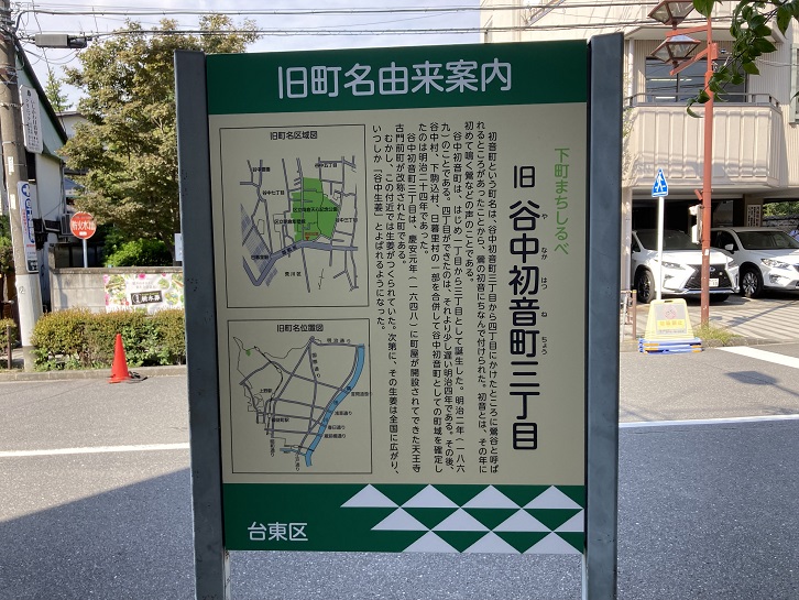 交差点の南方一帯は、かって谷中初音町三丁目と呼ばれていました。二丁目も三丁目も大して変わらないとは思うのですが、ここにも旧町名由来案内板が立っています。