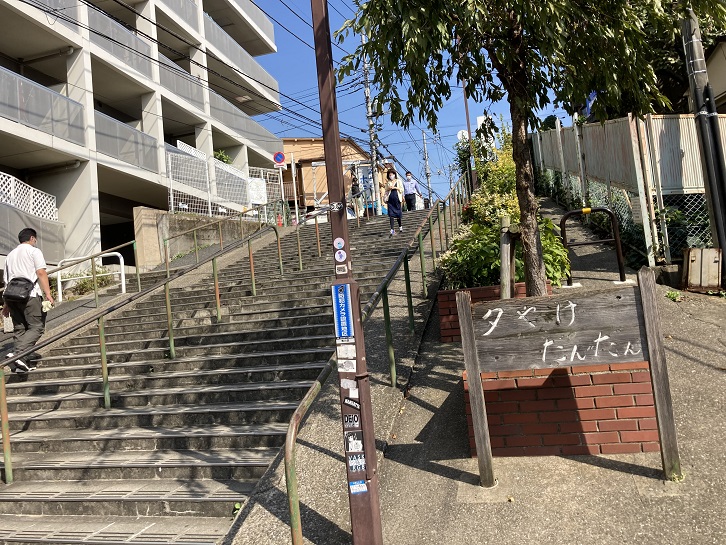 谷中銀座にやってきました。谷中銀座といえば見所ポイントGの「夕やけだんだん」ですね。夕方この階段に座って谷中銀座の方向を見ると綺麗な夕焼けが見えることから、一般公募によって選ばれました。