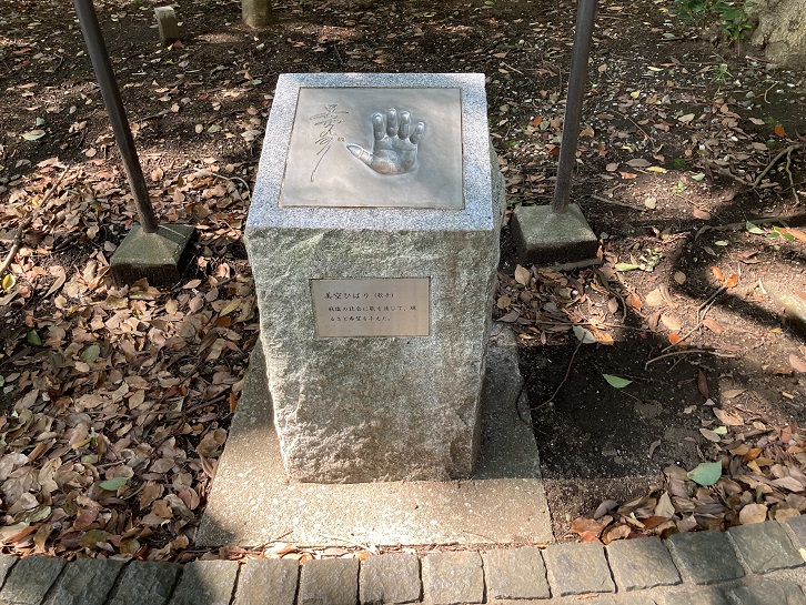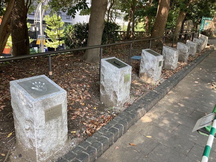 公園の植え込みの中に石柱が建っていて、上面には有名人の手形とか写真が貼られています。