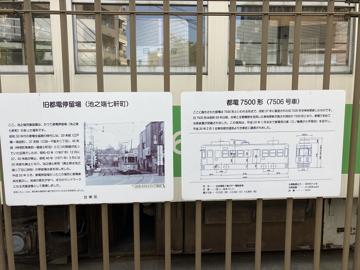 ここに展示された都電は7500形といわれる形式で、昭和三十七年に製造された旧7500形を車体更新したものです。旧7500形は昭和五十九年以降、台車と主要機器を流用した車体更新が施され(て)現在の7500形となり、都電で初めて冷房装置が搭載されました。この車両は、平成二十年1月末まで都電荒川線(三ノ輪橋から早稲田)を走行し、平成二十年2月1日東京都交通局より台東区に譲渡されました。