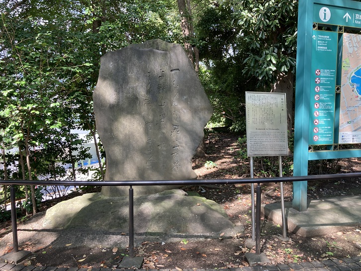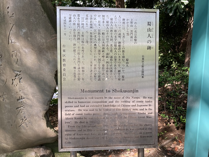 Shokusanjin is well known by the name of Ota Nanpo. He was skilled in humorous composition and the writing of comic tanka poems and had an extensive knowledge of Chinese and Japanese literature. He was said to be typical of Edo literary men, and in the field of comic tanka poems along with Karagoromo Kisshu and Akera Kanko he was referred to as one of the "Three Great Masters". He died in 1823. From the Edo period (1600-1868) Ueno was famous for its cherry blossoms and in 1938 a monument to Shokusarjin was erected at the ruins of Kuro-mon Gate at Kanei-ji Temple, engraved with a poem by Shokusanjin describing the Ueno cherry blossoms and Kuro-mon Gate.