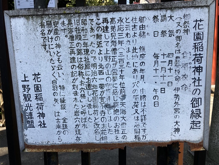 鎮座の年月、由緒は不詳ですが、住古より此地にあり、「穴の稲荷」又は「忍岡稲荷」と云われました。承応三年(330年位前)天海大僧正の高弟晃海僧正が霊夢に感じ廃絶のお社を再建して上野の山の守護神としました。この附近より北西一帯が寛永寺のお花畑であったので、明治六年花園稲荷と改名し、昭和三年現社殿にお遷ししました。旧社殿の跡は俗称「お穴様」と呼ばれ、晃海僧正再建の記が刻まれた岩穴が現存します。安産の神とも云い、特に縁談・金談の願がけにいただく「白羽の矢」は古来から有名です。