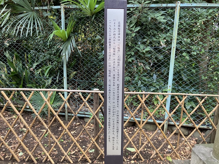 花園稲荷神社本殿に続く参道には幾つもの鳥居が並んでいます。鳥居の先には短い階段が下っています。稲荷坂は長さが約15mほどの階段で、坂名の由来は、花園稲荷神社に下りる階段ということでこの坂名になったと思われます。階段上の鳥居の下に案内柱が立っています。