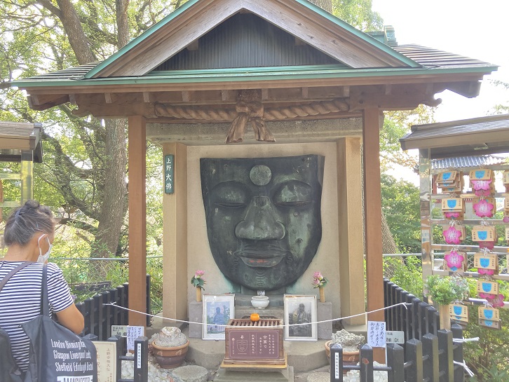 from Edo citizens. It was also a seated Buddha 3.6 meters tall. The face of the second Buddha images fell off during the Great Kanto Earthquake in 1923, and later the body and pedestal were delivered to the government under the Metal Acquisition Law, which ordered the delivery of metallic goods owned by citizens to the government, to produce weapons during the WWII. Only the face remains at Kanei-ji temple. In 1967 a wall was built on top of the hill and the Buddha head was enshrined on the wall in a relief style setting. Then in 1972 the Ueno Tourist Association built the current pagoda, including three Buddhist images of Yakushi Nyorai (Physician of souls), Gakko Bosatsu and Nikko Bosatsu.
