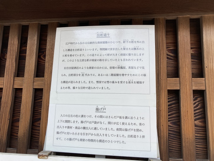 吉田屋酒店は、旧谷中茶屋町(現、谷中六丁目)の一角にあった江戸時代以来の老舗で、昭和六十一年(1986年)まで営業していました。台東区により当地に移築され、下町風俗資料館付設展示場として、昭和六十二年(1987年)5月に公開されました。この建物は明治四十三年(1910年)に新築して、昭和十年(1953年)に階段の付替えや正面入口のガラス戸の新設など一部を改装していますが、江戸商家の建築様式を伝えています。正面は一・二階とも軒下に桁を張り出した「出桁造り」で、一階の出桁を二重にして商家特有の長い庇を支えています。出入口には横長の板戸や格子戸を上げ下げして開閉する「揚げ戸」を設け、間口を広く使って酒樽など商品の運搬・販売に都合のよい構造となっています。板戸と格子戸は中柱の溝にそって上下させました。前土間形式で、一階は商品陳列や販売をするスペースと番頭が商品や金銭の出し入れを記録する帳場で、酒のほか醤油、塩、砂糖も扱い、二階は主に住み込みの店員の部屋として使われていました。平成元年(1989年)には一階店舗と二階部分及び道具・文書類が台東区指定有形民俗文化財となっています。なお展示資料はすべて区内外の方々から寄贈されたものです。