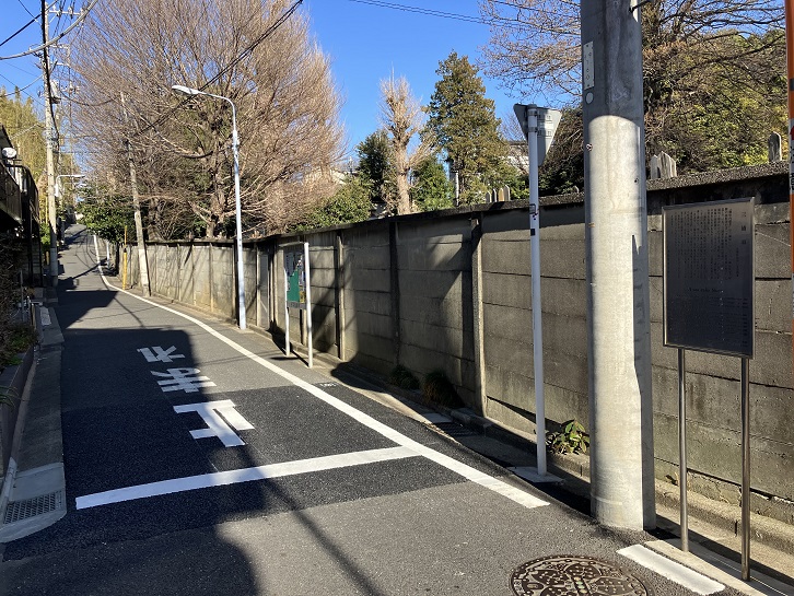 三浦坂は長さが約160mほどのかなり急な坂で、別名を「中坂」といいます。坂名は、江戸時代に三浦家下屋敷前の坂道だったことに因んで名付けられました。坂下に案内板が立っています。