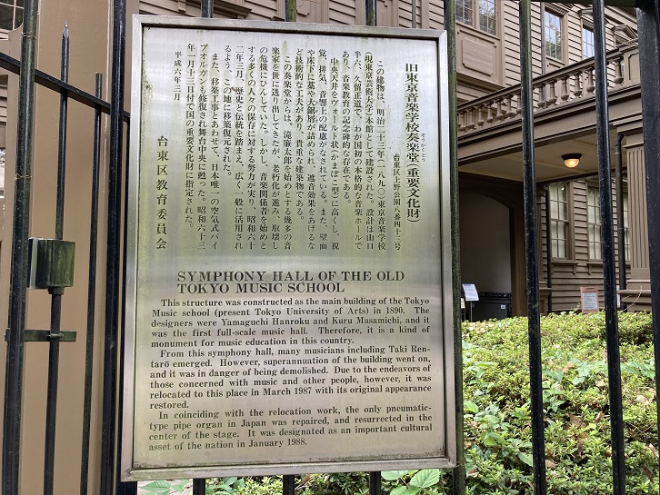 This structure was constructed as the main building of the Tokyo Music school (present Tokyo University of Arts) in 1890. The designers were Yamaguchi Hanroku and Kuru Masamichi, and it was the first full-scale music hall. Therefore, it is a kind of