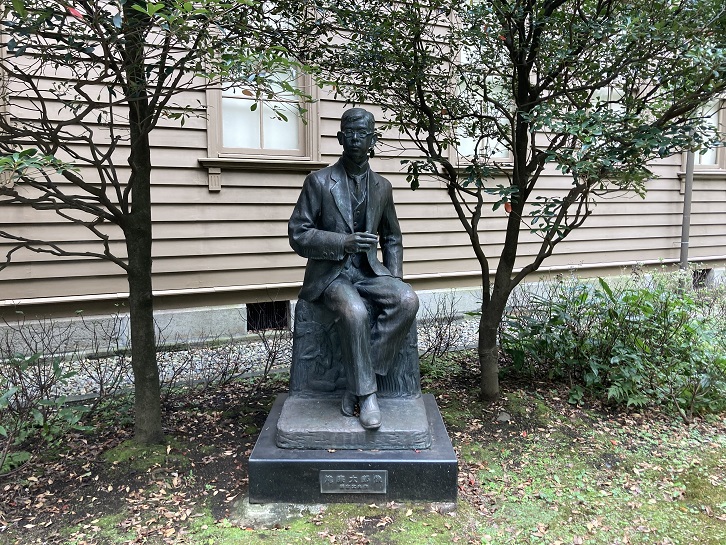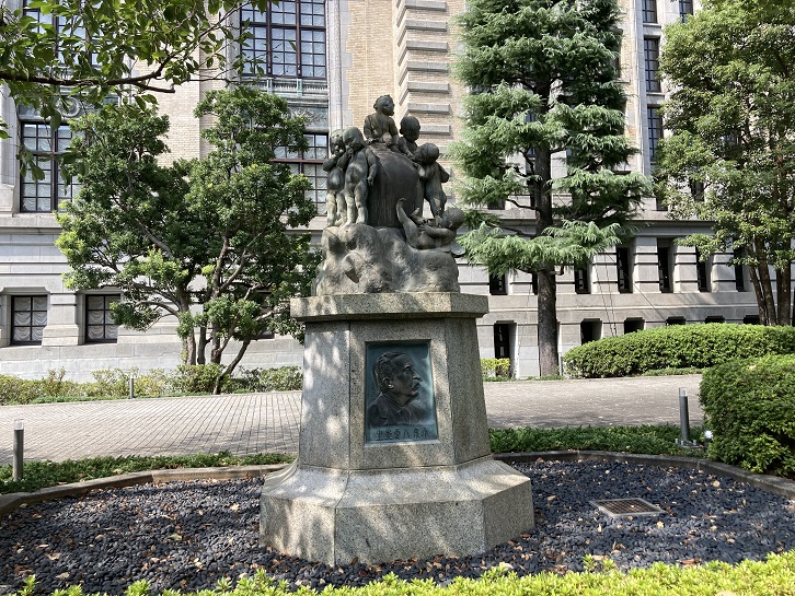 敷地内には、小泉八雲の記念碑も建っています。詩人として有名な土井晩翠は東京帝大時代の小泉八雲の教え子でした。土井晩翠の長男英一は小泉八雲に傾倒していましたが、大学在学中に結核のため23歳で亡くなってしまいました。碑文には、英一の遺言により、父晩翠(本名林吉)が広く国民に見てもらえる場所であることから昭和十年にこの記念碑を帝国図書館前庭に建立したということが書かれています。記念碑には、小泉八雲のレリーフがはめ込まれていて、その台上には天使が壺を囲む銅像「蜜(小倉右一郎作)」があります。
