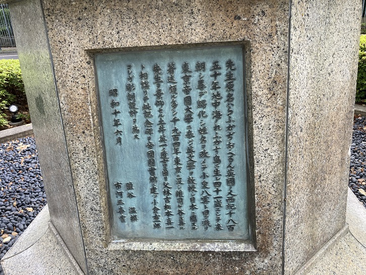 先生、原名ハらふかぢお・へるん。英国ノ人。西紀千八百五十年、地中海ノれふかす島ニ生レ、四十一歳ニシテ来朝シ、尋デ帰化シ、姓名ヲ改メテ小泉八雲ト日フ。職ヲ東京帝国大学ニ奉ジ、英文学ヲ教授シ、日本ニ関スル著述頗ル多シ。千九百四年、東京ニ没シ雑司ヶ谷ニ葬ル。先生ヲ景仰セル土井英一ノ遺言ニ因リ父林吉、松本喜一ト相謀リテ此記念碑ヲ帝国図書館ニ建ツ。小倉右一郎、コレガ彫刻設計ヲ為ス。