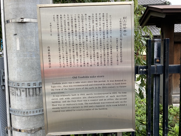Yoshida store was a sake store since Edo period. It was donated to Taito city, then was reconstructed and restored in order to hand down the form of the liquor store of the early in the 20th century to future generations. It was originally built in 1910, partly reconstructed in 1935. Its long eaves and wide entrance are characteristics of such merchant building, and the first floor was a counter and an office, the second