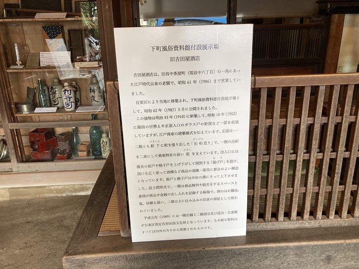 かつて谷中六丁目の一角にあった商家建築。吉田屋酒店は江戸時代以来の老舗であった。旧店舗の建物が台東区に寄贈され、明治から昭和初期にいたる酒屋店舗の形態を後世に遺すため、昭和六十二年移築復元して、当時の店頭の姿を再現、展示している。平成元年には、一階店舗と二階部分及び道具・文書類が台東区指定有形民俗文化財となった。棟札によれば、明治四十三年(1910年)に新築して、昭和十年(1935年)に一部改築したもの。正面は一・二階とも出桁造り商家特有の長い庇を支え、出入り口には横長の板戸を上げ下げして開閉する揚戸を設け、間口を広く使って販売・運搬の便を図った。一階は店と帳場で、展示している諸道具類や帳簿などの文書類も実際に使用されていたもの。帳場に続く階段をのぼると三畳半と八畳の部屋があり、店員等が使用していた。向かって右側の倉庫部分は、外観のみを明治四十三年の写真にもとづいて復元した。店舗後方の和室部分は構造的補強の必要から増設したものである。