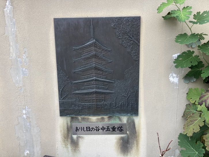 谷中の五重塔は、天王寺(旧感応寺)の塔として正保元年(1644年)に創建されました。安永元年(1772年)に焼失しましたが、天明八年(1788年)に再建工事が開始され、寛政三年(1791年)に完成しました。以後、160年、幸田露伴の小説「五重塔」のモデルにもなった五重塔は、度重なる災害や、戦争に耐え、谷中のランドマークとして親しまれてきましたが、昭和三十二年(1957年)7月に焼失してしまいました。