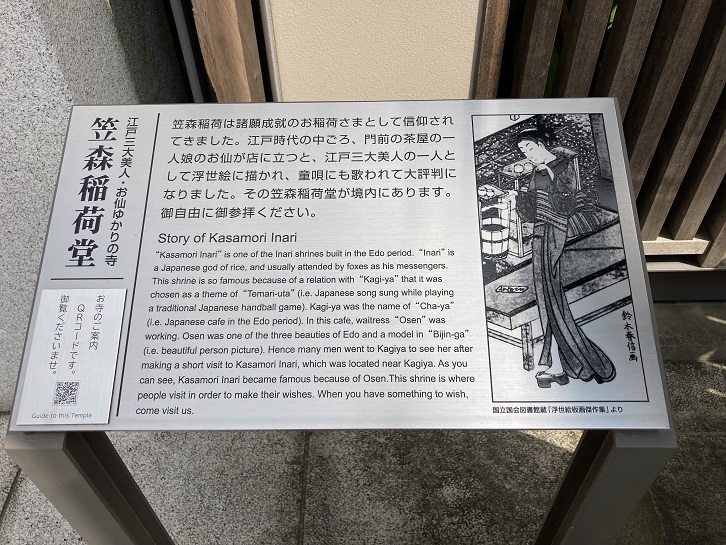 a Japanese god of rice, and usually attended by foxes as his messengers. This shrine is so famous because of a relation with "Kagi-ya" that it was chosen as a theme of "Temari-uta" (i.e. Japanese song sung while playing a traditional Japanese handball game). Kagi-ya was the name of "Cha-ya" (i.e. Japanese cafe in the Edo period). In this cafe, waitress "Osen" was working. Osen was one of the three beauties of Edo and a model in "Bijin-ga" (i.e. beautiful person picture). Hence many men went to Kagiya to see her after making a short visit to Kasamori Inari, which was located near Kagiya. As you can see, Kasamori Inari became famous because of Osen. This shrine is where people visit in order to make their wishes. When you have something to wish, come visit us.